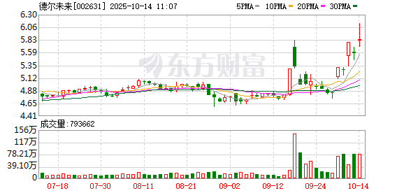 德尔未来再度涨停,5个交易日内录得3个涨停,累计涨幅为26.92%,累计换手率为38.91%。截至9:37,该股今日成交量3046.41万股,成交金额1.79亿元,换手率3.84%。最新A股总市值达48.87亿元,A股流通市值48.65亿元。