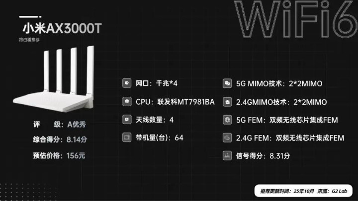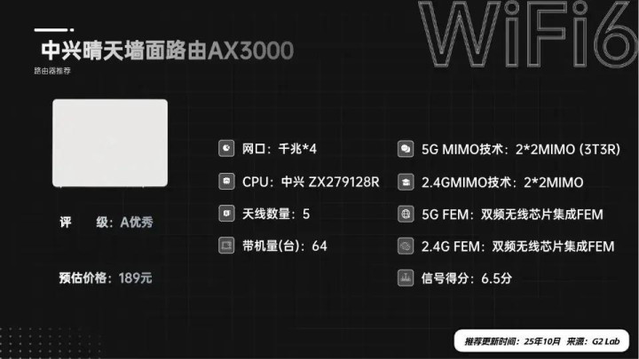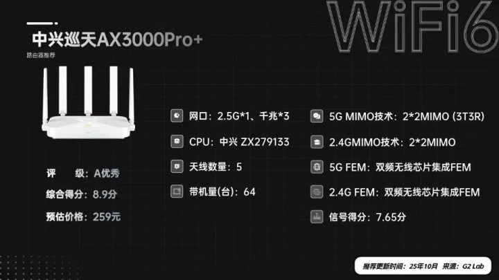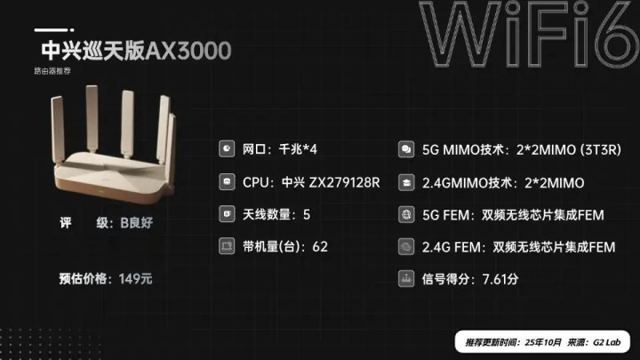 是中兴3000系列中最便宜的一款,价格149元,综合评分7.6分、信号评分6.99,带有自研双核芯片+5dBi高增益天线,不过各方面性能均衡,小户型家庭一台基本够用了。