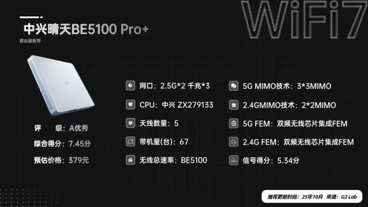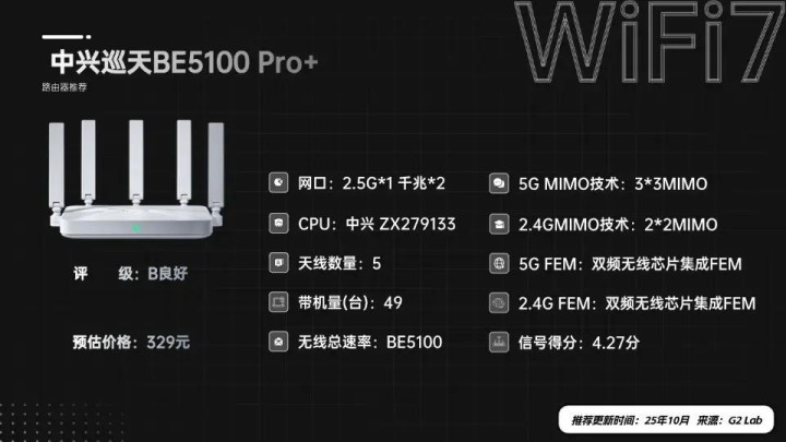 中兴巡天BE5100 Pro+是我们一直推荐的一款路由器。2 个 2.5G 网口和 2 个千兆网口,6.68分的评分,和华为BE7 Pro的得分接近,名次相差一名,但价格差了可不少,中兴这款到手只有329