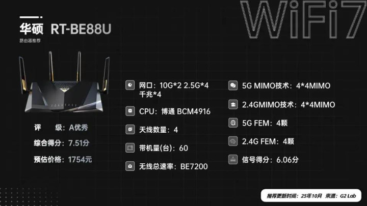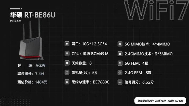 需求更高可以选择BE88U,价格在1759左右,是BE7200规格的路由器。综合评分7.51,比86U多了4个千兆口。这两款性能都是不错的。