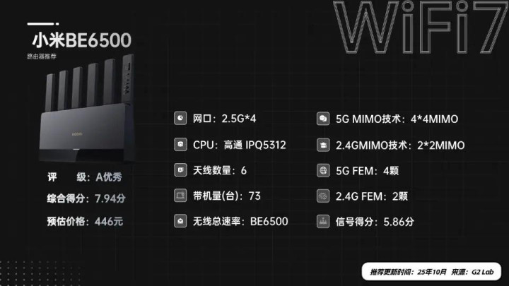 在WiFi7路由器中,小米的BE6500也是性价比比较高的路由器,这台路由器特别能干重活,搭载高通 IPQ5312 CPU,带机量 73 台,信号得分 5.86 分,综合得分7.49 分,排名第8,国补价格 446 元。非常适合智能设备多的家庭使用。