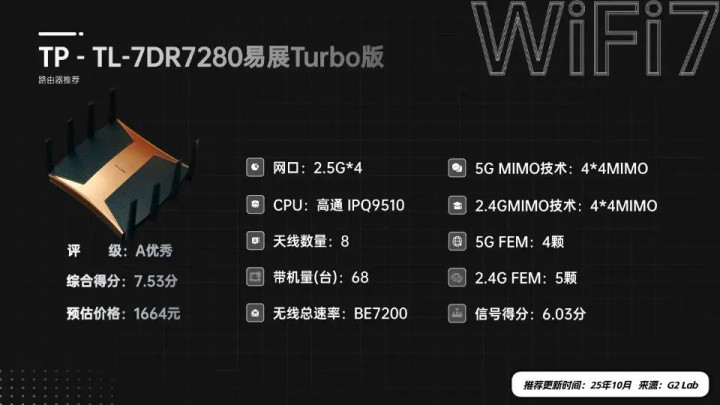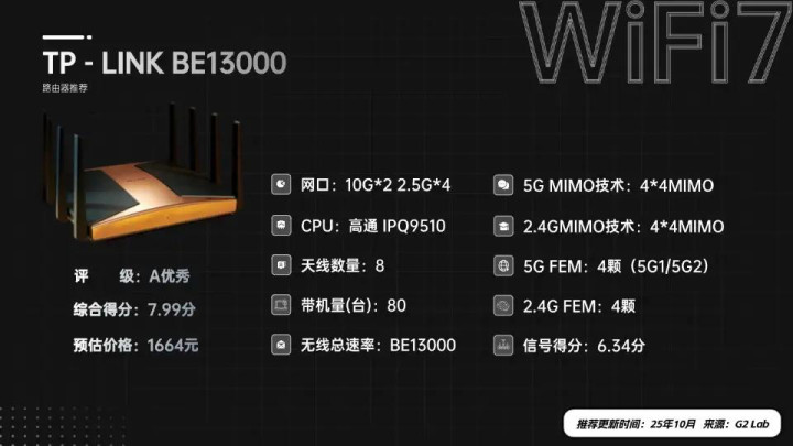 到手价1699,TP - LINK BE13000便宜1、2百元。是BE7200规格的路由器,4个2.5G,8根外置天线。综合得分7.53分,是一款实测性能非常不错的产品。