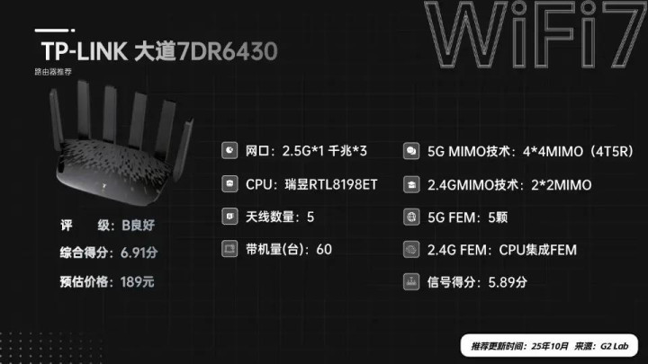 7DR6430则使用了瑞昱的Wi-Fi7芯片组,虽然瑞昱以交换机芯片见长,但是这次出手的Wi-Fi7芯片组性能还不错,6.91分的综合好评分,让这台路由器排名第16,还恰好和小米万兆得分一样。入手价格同样只需要179元,而且这台路由器信号不错,6.91分的评分,在我们新版Wi-Fi7路由器信号排行榜中排第8,进入TOP10了。