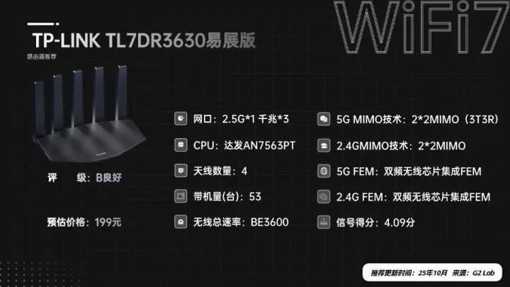 7DR3630采用联发科子公司达发科技的SOC,BE3600的规格,集成度比较高,虽然综合评分6.56分,排名第24,但是179块钱的入手价格,排在它前后路由器可真是要贵多了,作为入门级Wi-Fi7路由器,性价比还是比较高的。