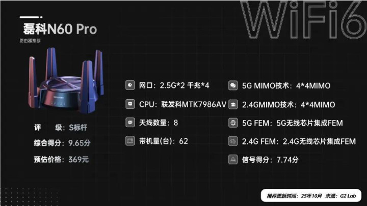 磊科N60是目前最值得推荐的AX6000路由器之一,国补后369。联发科全套Filogic 830平台硬件+1个2.5G口的组合,综合得分9.65分,WiFi6排行榜的TOP2。在雷神X4下架之后,这款路由器就超值了,一台覆盖中小户型。