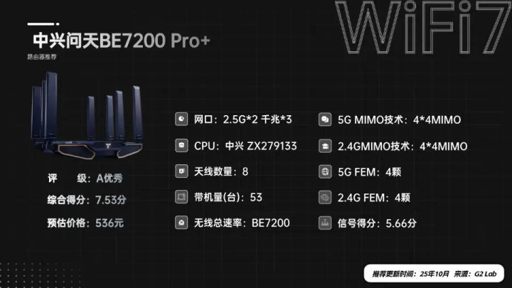 价格在529元,是是中兴的旗舰路由器了,综合性能特别猛,综合得分8.45分,8根天线的配置,它一共有8颗FEM芯片、一个芯片对应一根天线,8颗FEM芯片都是wifi7的,真是的下血本了,然后无线部分是高通的芯片组。同时,2.4和5Ghz全部配置了Qorvo的FEM功放,无线吞吐强、多终端表现非常出色,在强干扰下的稳定性也表现得非常好,漫游过程中也不出现卡顿,非常全面的水桶机了,大部分用户选它就够了。