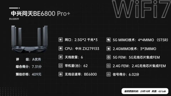 中兴问天BE6800Pro+,这款路由器外置6根天线,信号能力强,综合得分7.31分,排行第13,性能是超出规格预期的,价格也比较合适,国补入手价格 409元,对于信号要求高的朋友,非常适合用这台路由器作为主力路由器。