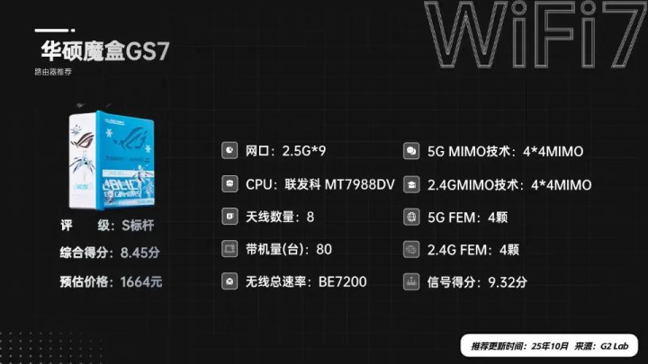 国补¥1699,华硕魔盒GS7非常优秀,它使用了联发科的旗舰芯片,8根天线,配置很高,是目前唯一一台S级评价的Wi-Fi7路由器。魔盒是专为电竞场景设计的WiFi7路由器,凭借多网口、低延迟优化和紧凑设计,是ROG生态用户的首选。不过没有10G网口,选择的时候要注意看一下是否有需求。