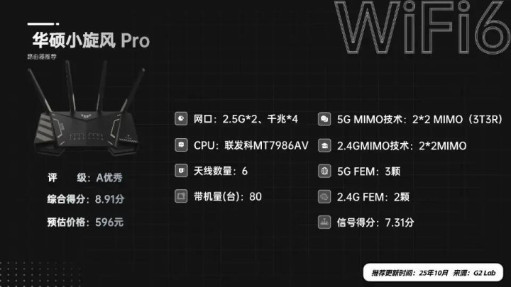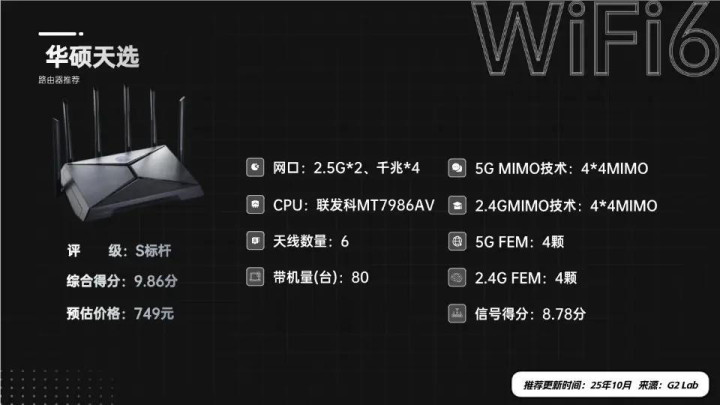 价格来到749,华硕天选9.86分的评分,依然是WiFi6路由器的天花板,也是华硕少有的挺有性价比的产品,采用联发科芯片组,双2.5G网口,8路独立FEM功率放大芯片,信号极佳。对于信号要求高,且预算充足的用户,可以直接入手这款。