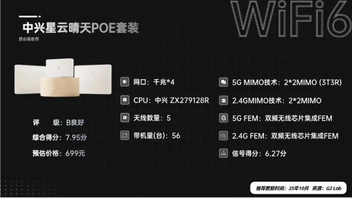 套装我们推荐一款,中兴星云晴天POE套装,是WiFi6组网非常值得选择的套装,有中兴晴天墙面路由器的底子,这个套装的性能不错,在POE网线供电的家庭组网产品中,属于性价比非常高的了。国补679一套。